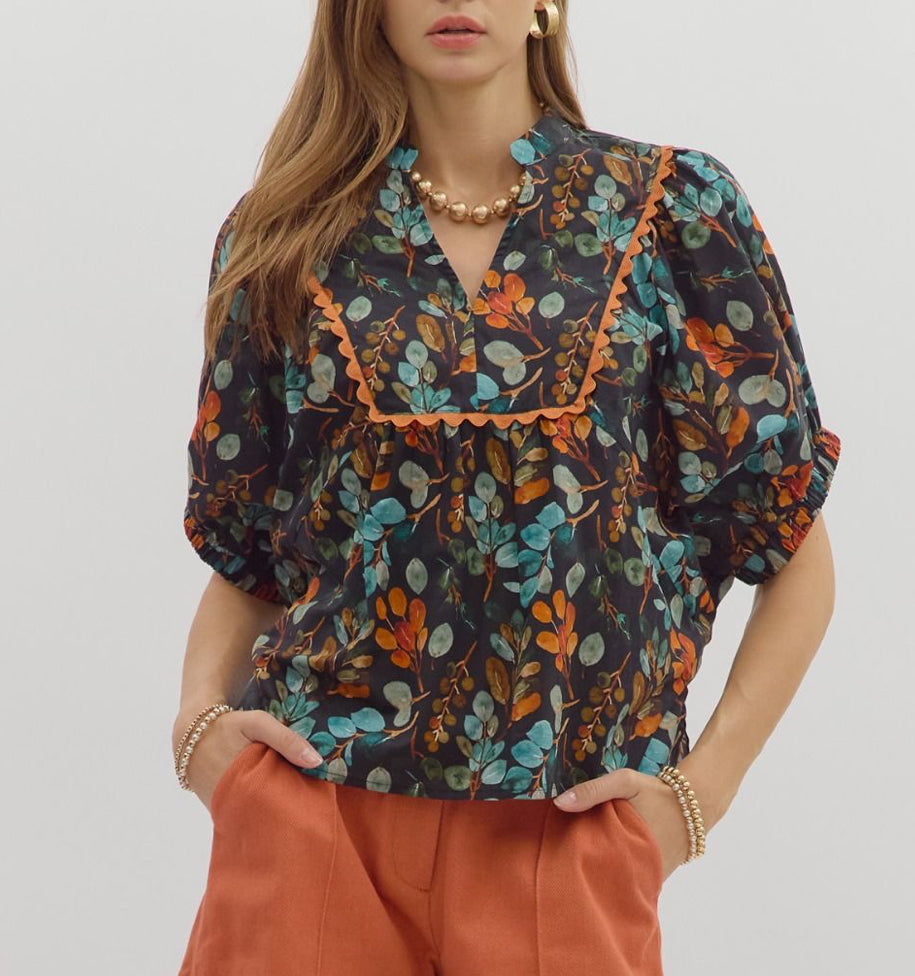 The Autumn Garden Top combines a botanical print with a flattering V-neck and band collar for a fresh, confident look. Its dolman sleeves and contrast scallop trim inset add unique style, while the lightweight woven fabric ensures comfort without sheerness. This unlined top offers a perfect balance of earthy tones and bold accents, delivering a subtle vintage charm that stands out effortlessly.