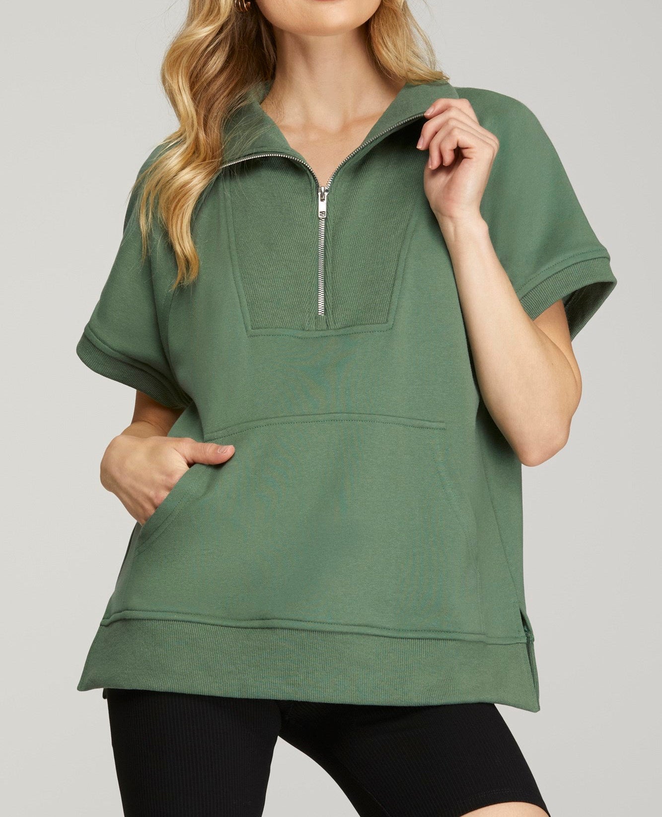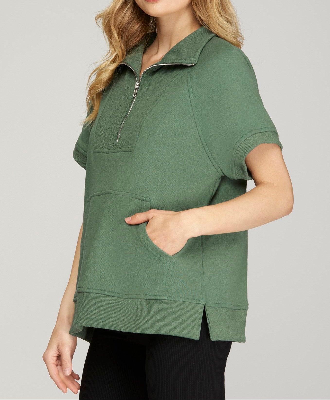 Get ready to go in style with our Green Light Go Top! This top features short sleeves, a convenient half zip, and a cozy French terry fabric. With a front pocket for all your on-the-go essentials, this top is perfect for running errands or any other adventure.