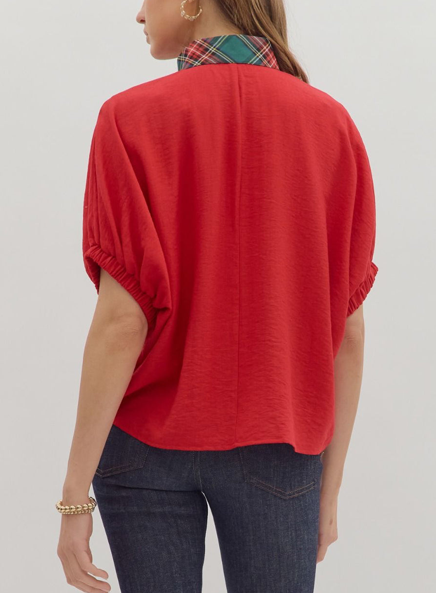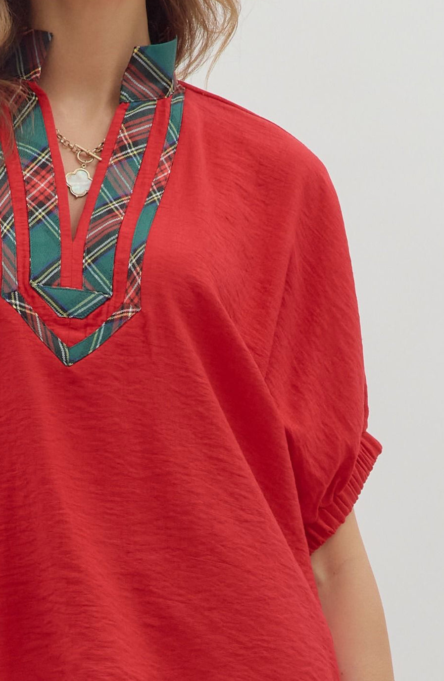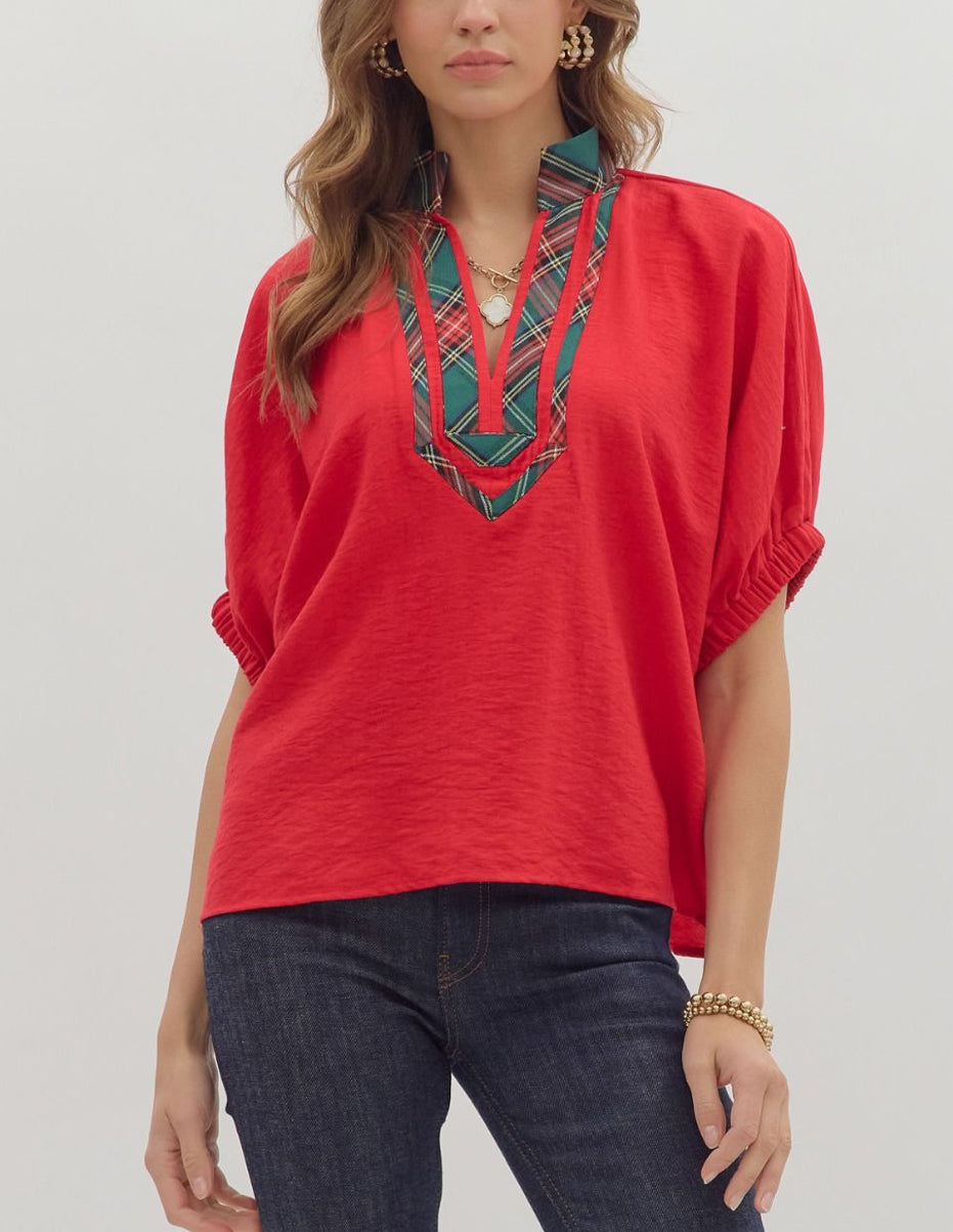 A bold red meets classic plaid in this fun and flattering top. Featuring a split neckline with contrast green and red tartan trim, this relaxed fit blouse has short dolman sleeves with gathered cuffs for a touch of shape. Easy to dress up or down, it’s the perfect pick for holiday get-togethers, casual Fridays, or anytime you want to stand out.