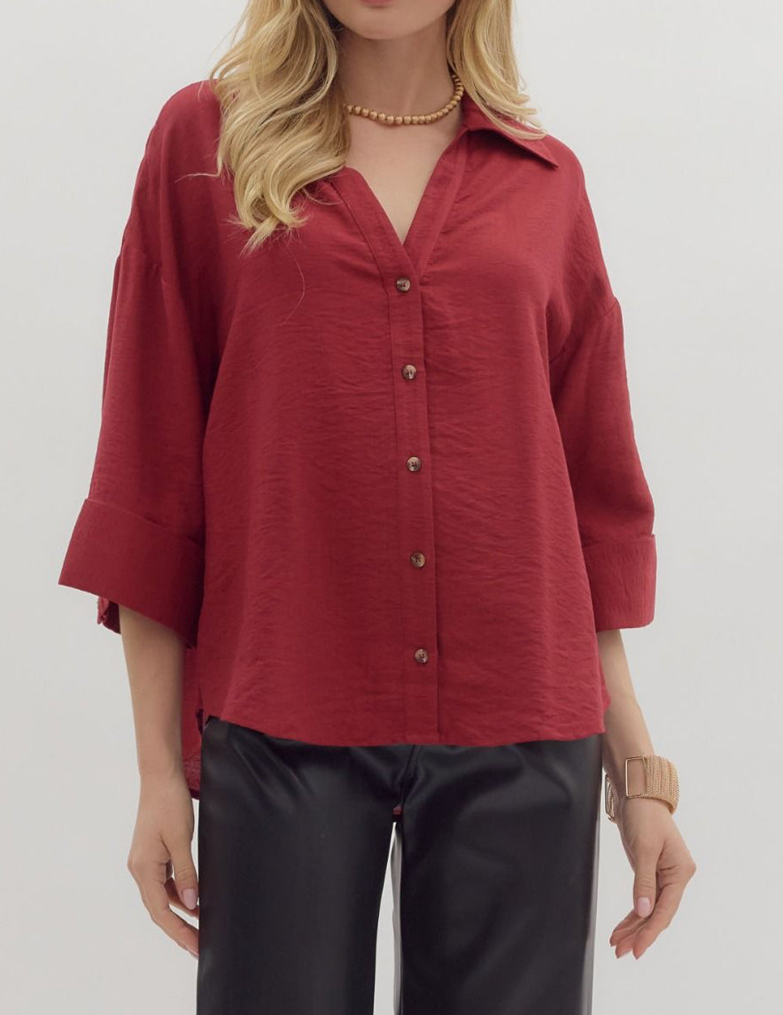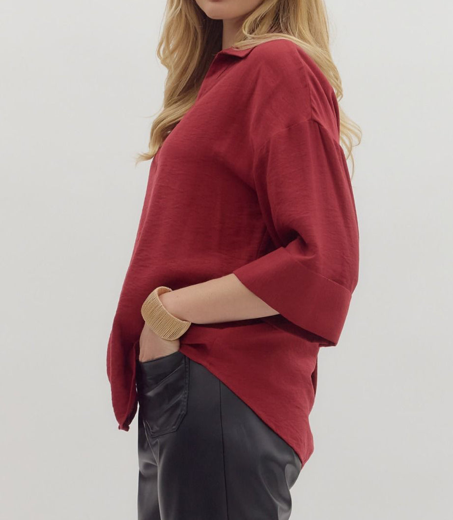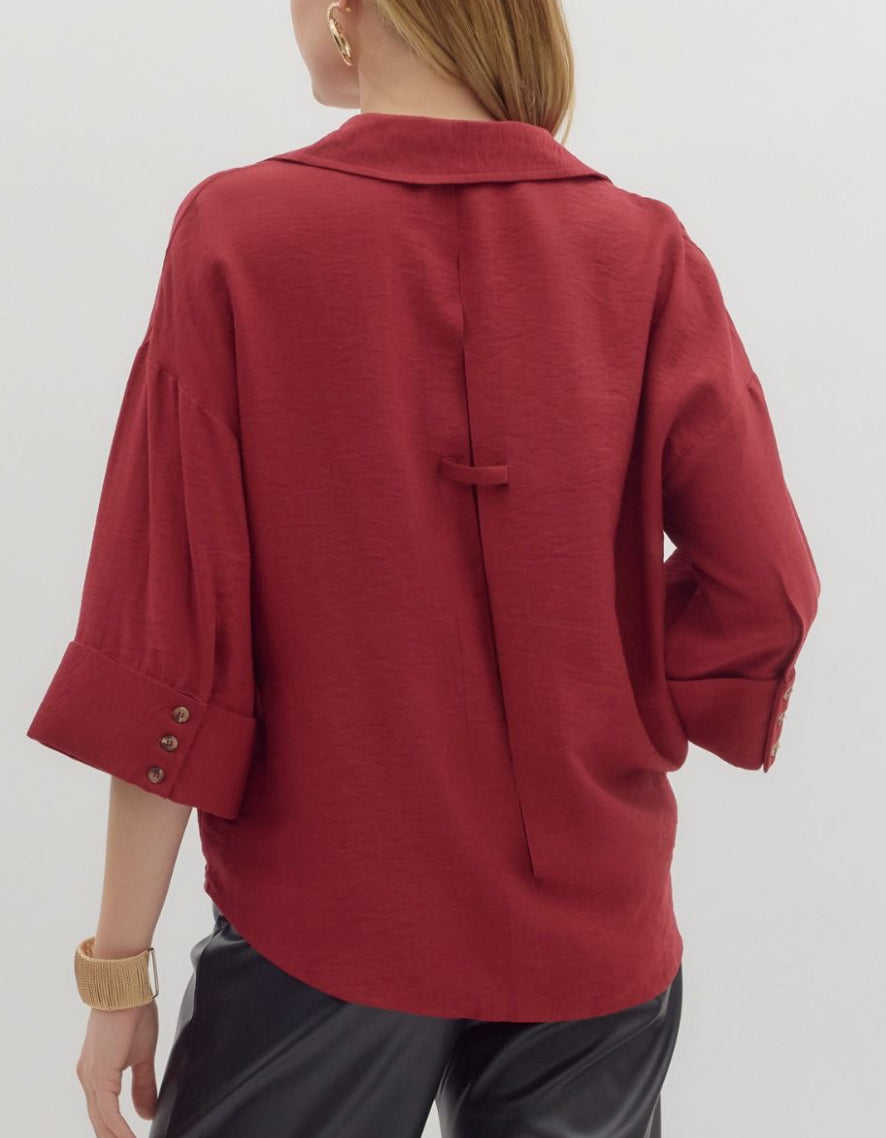 Make a rich statement in this garnet-hued blouse featuring a spread collar, button-front closure, and wide ¾ sleeves with structured cuffs. Its tailored shape and bold color make it a polished pick for workdays or dinner plans alike.