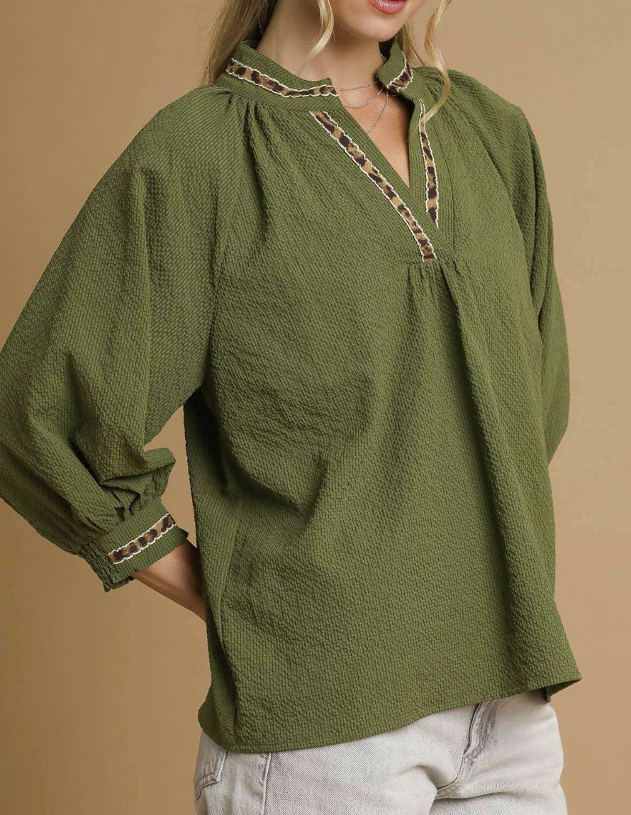 Bring bold energy to your everyday look with the Olive & Out Loud textured top. The relaxed fit and billowy sleeves keep things comfy, while leopard print trim at the neckline and cuffs adds the perfect hint of wild. With its flattering split neckline and unique details, this top is made for dressing up your denim or keeping it casual with cutoffs and sandals.