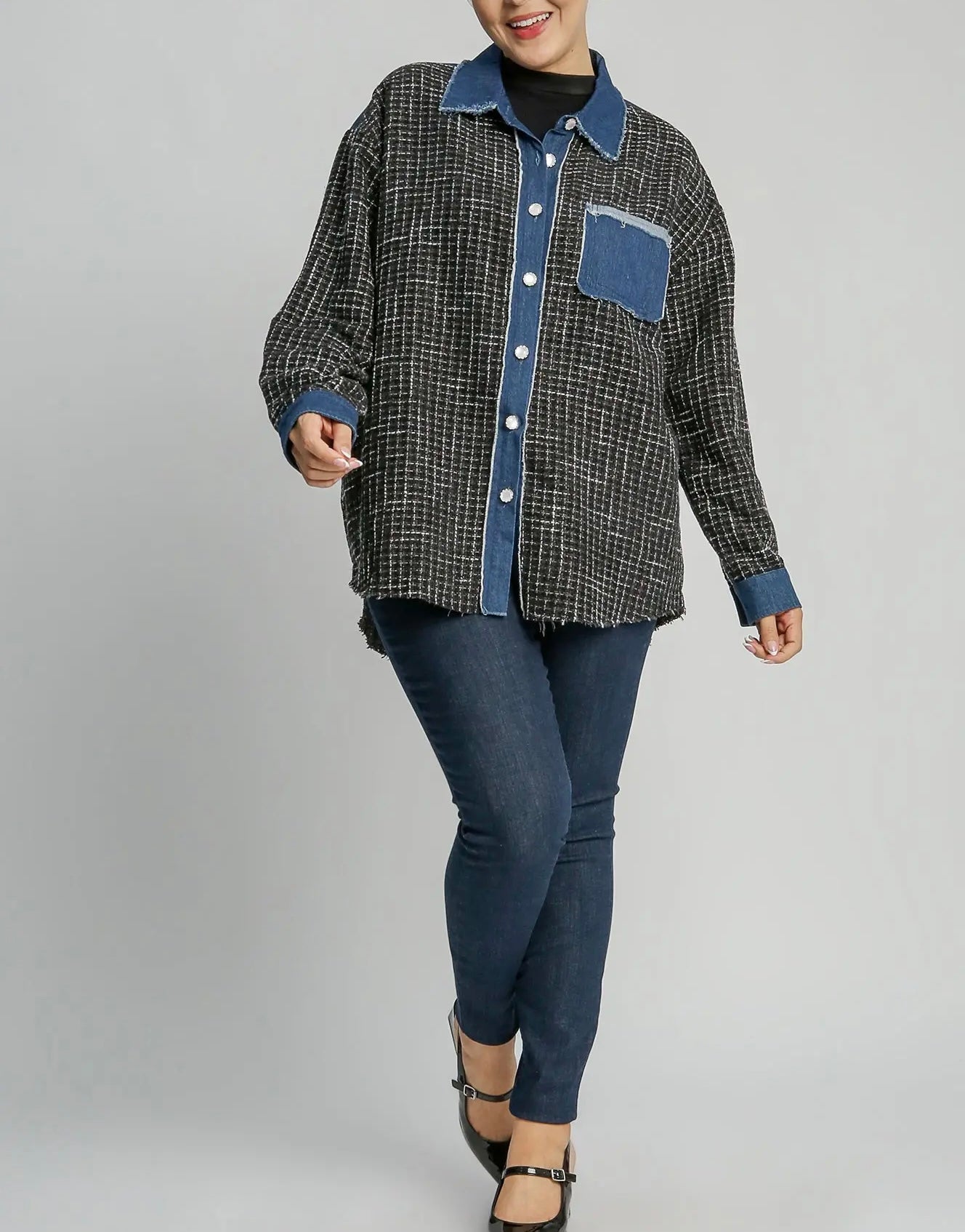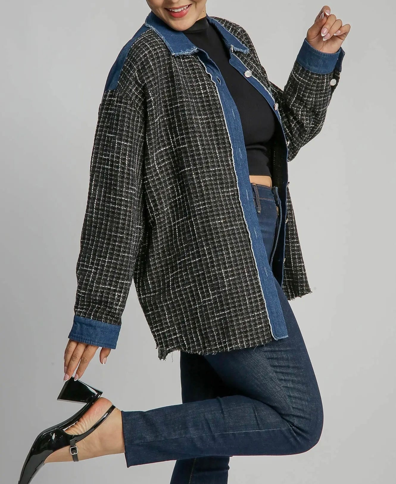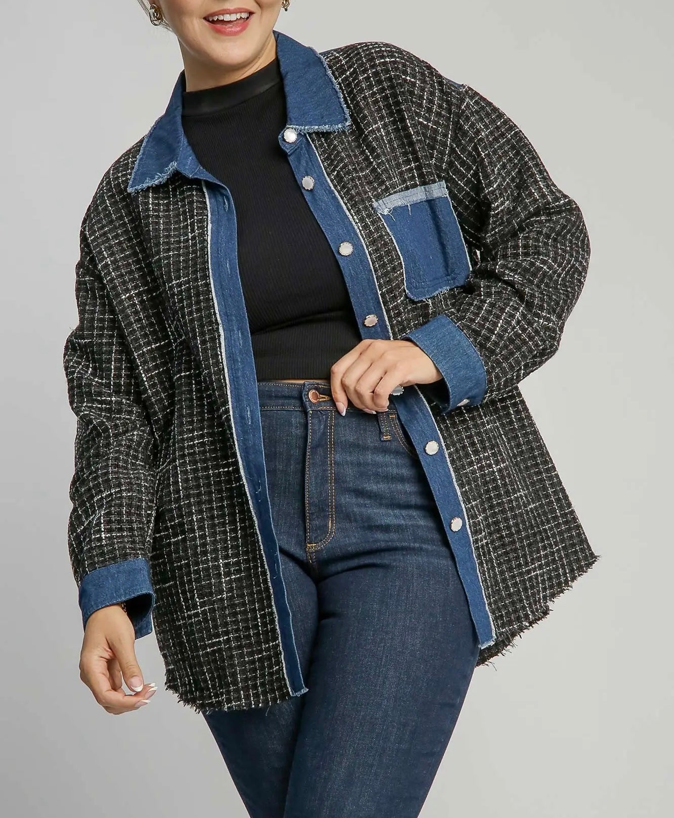The Ashton Shacket blends classic plaid with denim accents for a modern, laid-back layer. Featuring a button-down front, chest pocket, and raw hem, this versatile piece is perfect for pairing with denim or tossing over a simple tee.