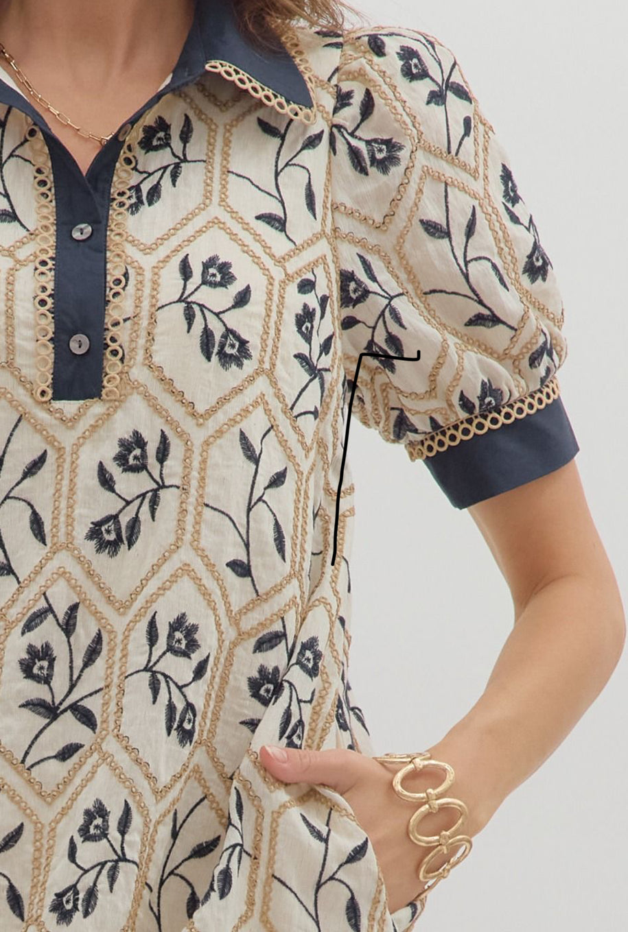 Step out and effortless elegance with our Vintage Garden Dress. Featuring a geometrical, floral, embroidered design, puff sleeves, and a chic contrasting color, this dress is perfect for church, brunches or, gatherings style it with simple gold, jewelry, and sandals for a timeless look that turns heads wherever you go.